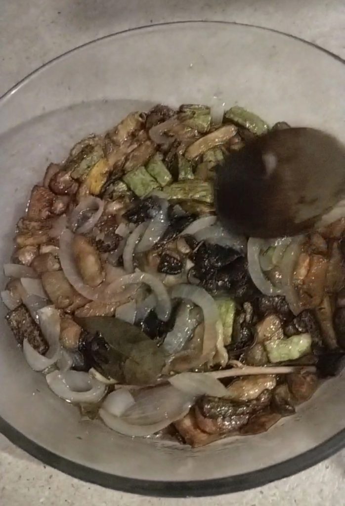 Now prepare the marinade. In a pan with a bit of olive oil, put the sage leaves, garlic cloves, sliced onion, and lightly sauté. Add the vinegar, water, salt, and cook for about 15 minutes.