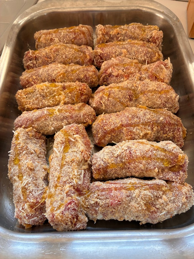 • Dip each roll first in the egg and then in the breading, placing them one by one in a previously oiled baking tray. When all the rolls are breaded and neatly arranged in the tray, drizzle them with extra virgin olive oil and bake for 20 minutes at 356°F in a convection oven, otherwise 30 minutes in a conventional oven. Let them rest 5 minutes before serving with a side of Arrianate potatoes!