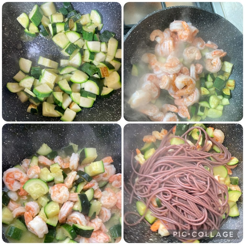 Our black rice spaghetti with shrimp and zucchini is ready.