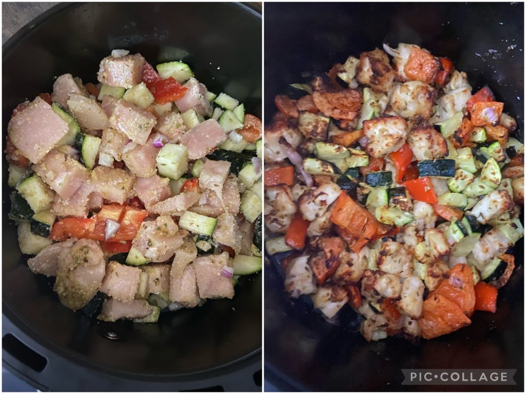 Country-style chicken bites are a quick and easy main course with a side dish. Thanks to air fryer cooking, the meat remains tender and juicy, while the vegetables are soft inside but crispy outside. With a bit of creativity, you can vary the ingredients to make a tasty and healthy dish.