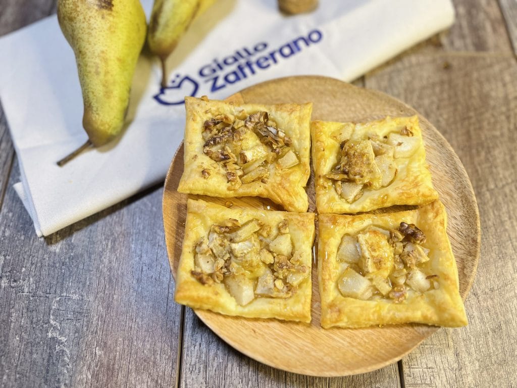 Once ready, let the puff pastries with pears and Brie cool slightly, then transfer them to a plate and drizzle with honey.