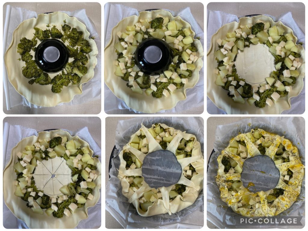 All you need is a roll of puff pastry, broccoli and boiled potatoes left over, and in half an hour you’ll prepare a tasty ring with a very scenic appearance.