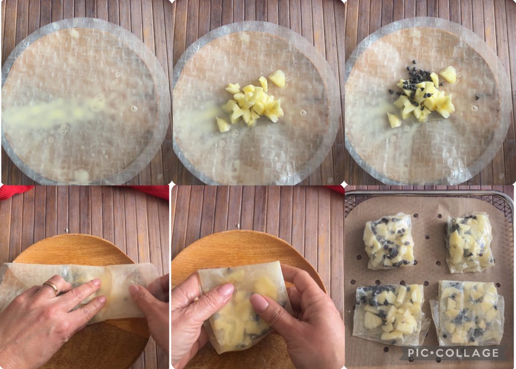 Fold the sides of the rice paper like a package, sealing the filling well inside, and