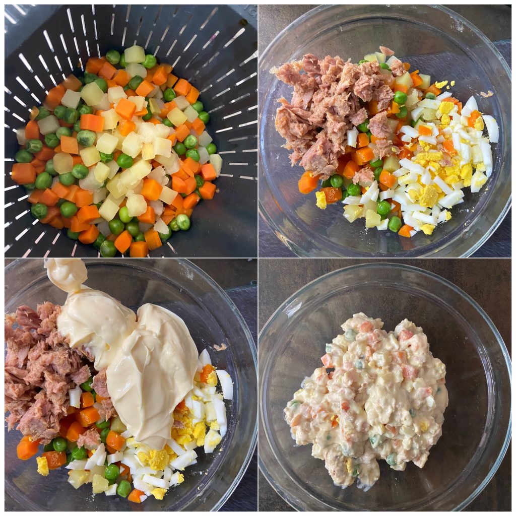 • In a large pot, boil the potatoes and carrots in salted water until they are tender but still firm to the bite. Add the peas in the last 3-4 minutes of cooking. Drain the vegetables and let them cool.