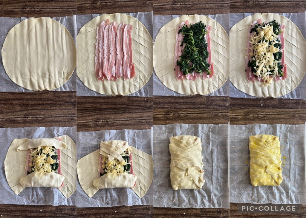 Arrange the slices of bacon in the center of the puff pastry so that they cover the entire length of the uncut area.