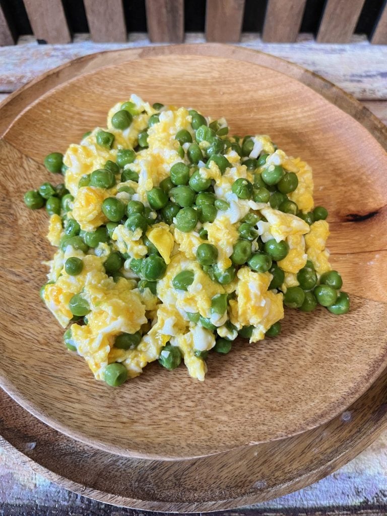Our Scrambled Eggs with Peas are ready. Let’s bring them to the table with a nice slice of bread!