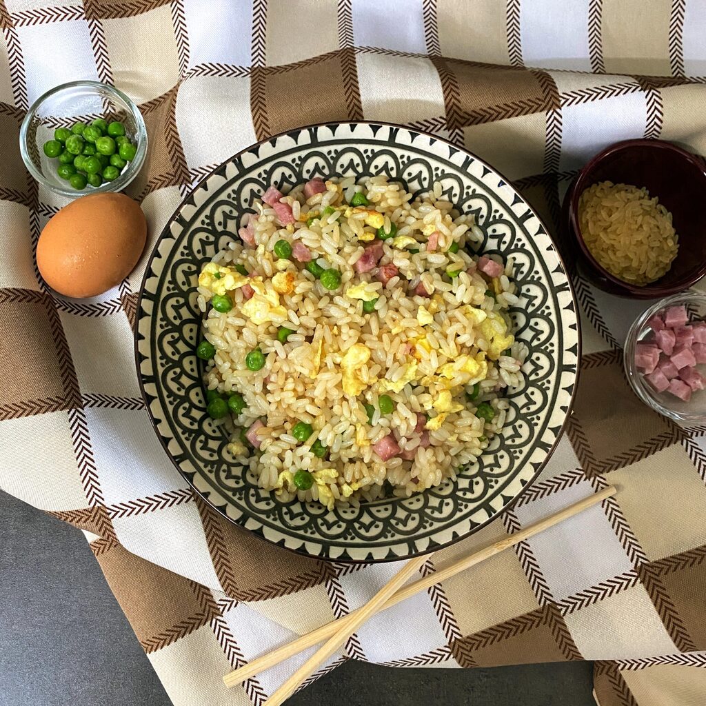 Cantonese rice is the most accessible dish for anyone who has never tried Westernized Chinese cuisine because it essentially uses ingredients familiar to our culture, simple rice with scrambled eggs, cooked ham, and peas. The uniqueness is given by flavoring everything with rice vinegar and soy sauce.