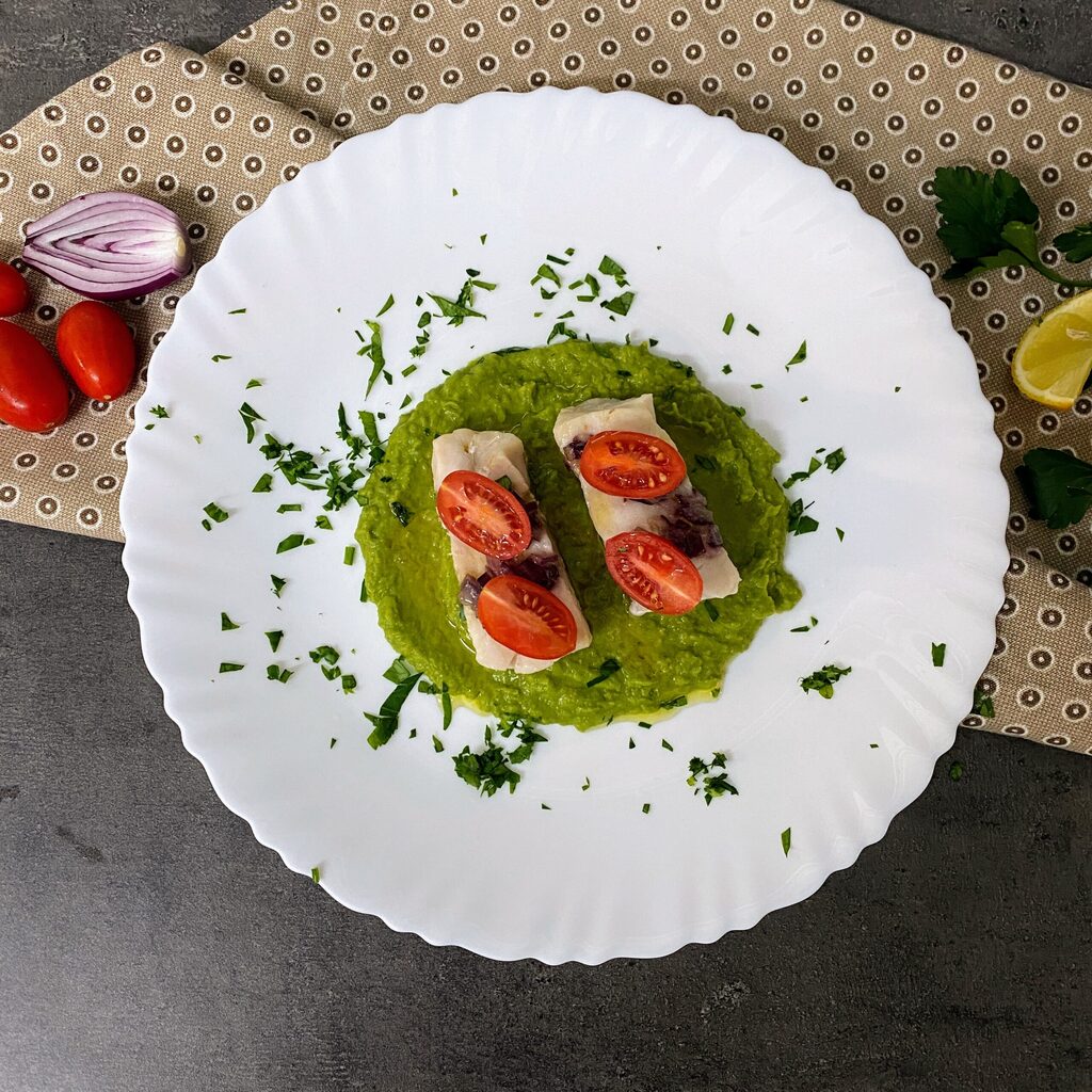 Take a plate, put the pea velouté as a base, and lay the cooked cod flowers on it, add halved cherry tomatoes on top, a drizzle of oil, and a sprinkle of chopped parsley