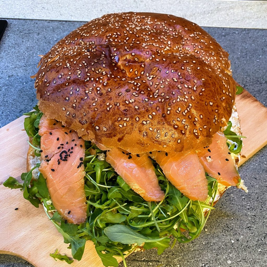 Fill with slices of smoked salmon and cover with the top part of the brioche