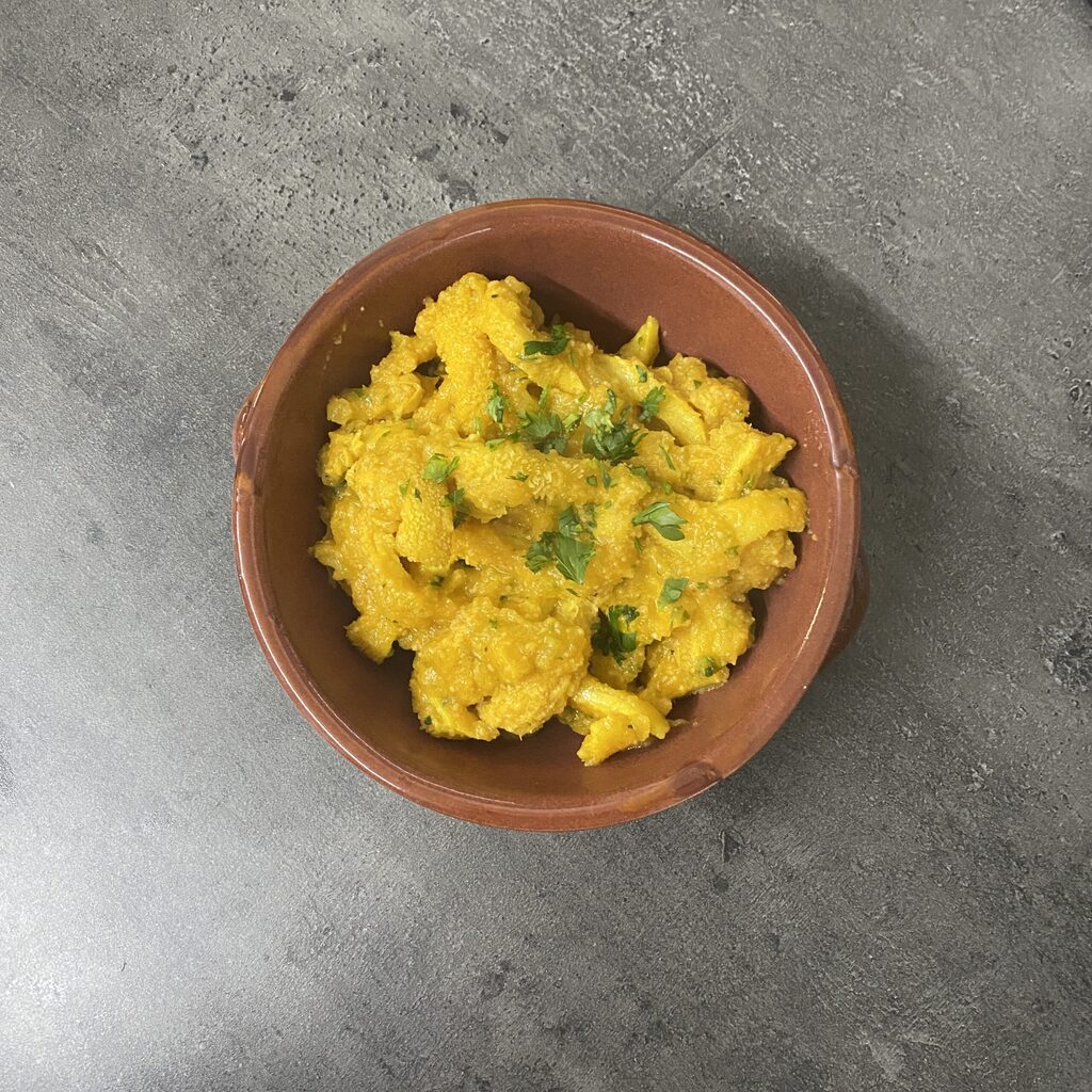 Specifically, for this preparation, a humble part (offal) from some parts of the beef stomach is used, which is first boiled and then cooked together with a sauté of onion, saffron, cheese, and breadcrumbs. The whole is then scented and flavored with plenty of fresh parsley which gives the final touch.