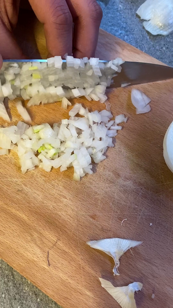 • Meanwhile, dice a white onion and sauté it in a pot with extra virgin olive oil and deglaze with white wine
