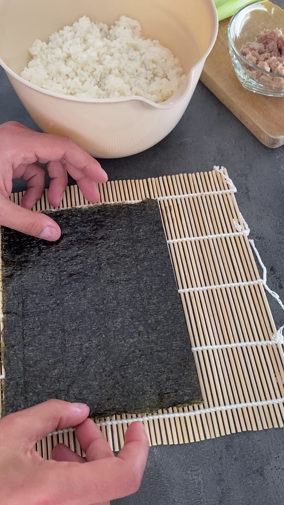 • For the next step, take the mat, preferably lined with plastic wrap, and place 1/2 sheet of nori seaweed on it