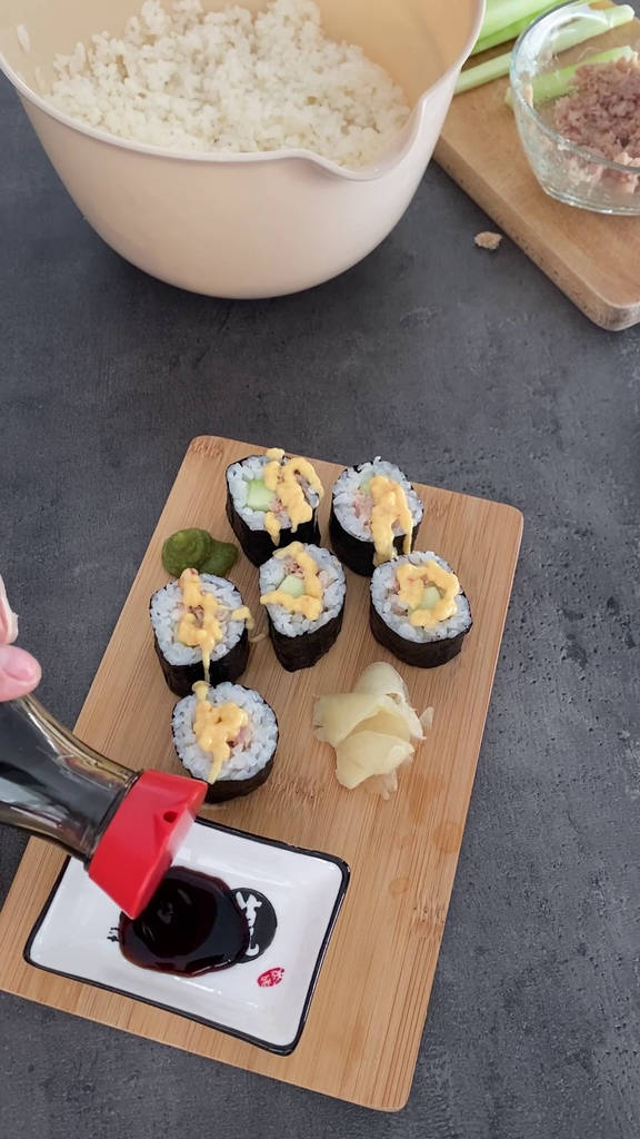 • As the final step, serve and accompany with ginger, wasabi, and soy sauce. You can also create a sauce with mayonnaise and sweet and sour to put on the osomaki