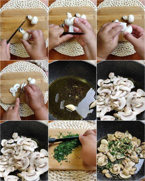 As soon as the garlic cloves begin to brown slightly, add the cut and cleaned mushrooms. Adjust with salt and season with a sprinkle of pepper. Cook the mushrooms for 5 minutes over medium heat without the lid, stirring occasionally. Towards the end of cooking, add some fresh chopped parsley and stir again. Let the mushrooms absorb the flavors for a few more moments and turn off the heat.