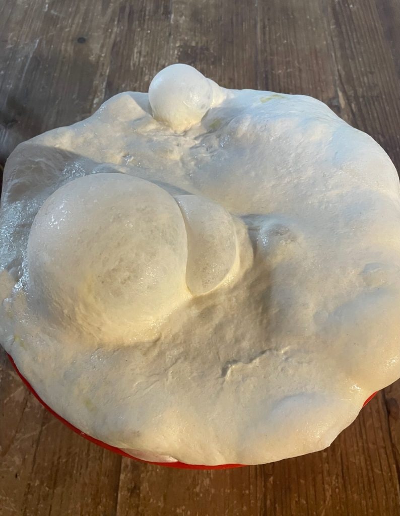 Add the rest of the flour and gradually the water, mixing with one hand or with a spoon. Knead until you have a dough that we let rise for 30 minutes after covering with a drizzle of oil. Using a drizzle of oil, lift and fold the dough over itself until you have a smooth and well-incorporated dough. Repeat this operation 2 or 3 times with a 30-minute rest. Let rise again or in the fridge until the next day, or for a few more hours.