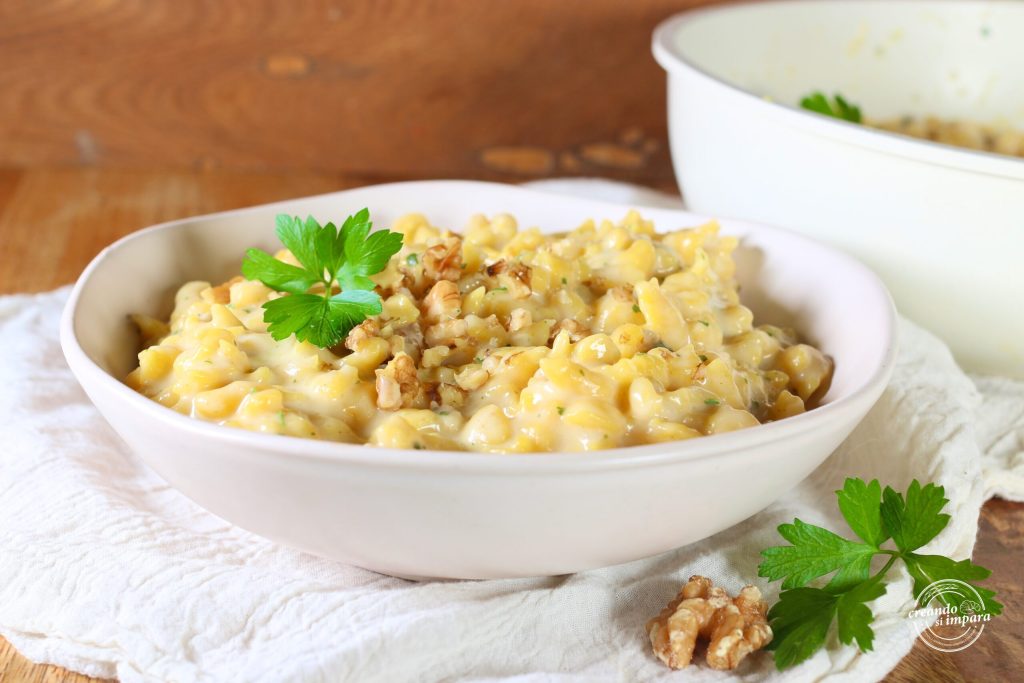 Pumpkin spatzle without eggs, a rich and tasty dish that I garnished with rice cream and walnuts. It’s simple and quick to prepare, the longest part is probably the cooking of the pumpkin, and when I prepare them, everyone always likes them. I also like to prepare spinach spatzle, always without eggs. To prepare them, you need the appropriate tool, which is easily found in home goods stores, online, and in the most well-stocked supermarkets.