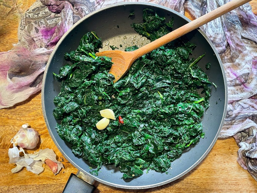 Bring plenty of salted boiling water to a boil. Drop in the leaves and blanch them for about fifteen minutes. Drain them, let them cool slightly, and squeeze them.