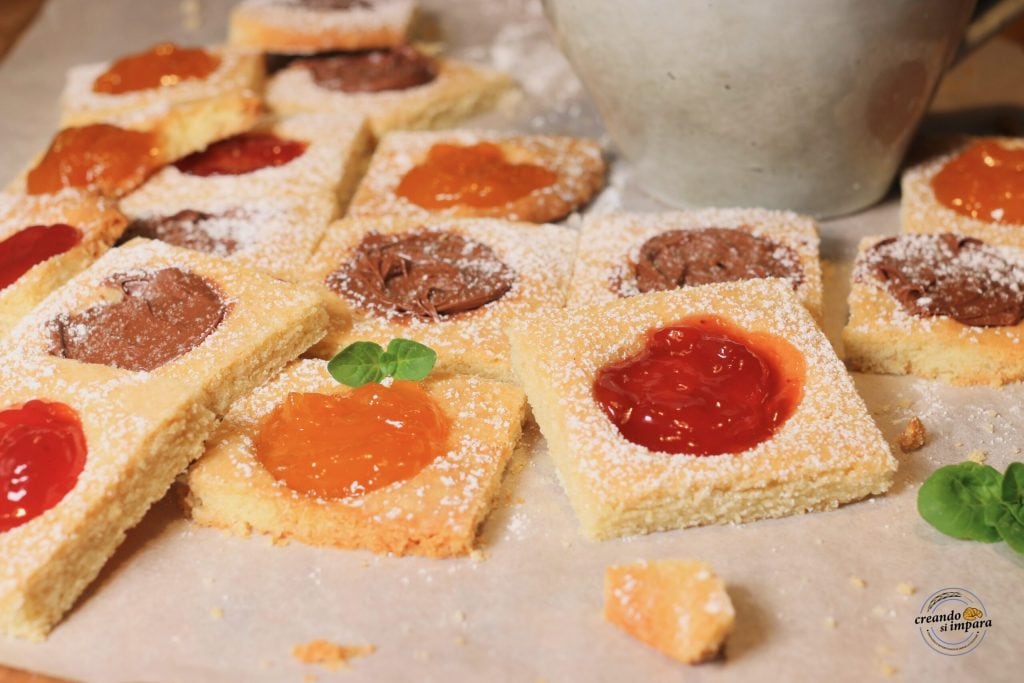 Remove the pastry from the oven while not fully cooked, and using the previously used small glass, reshape the indentations that have shrunk a bit. Finish baking for another 10 minutes. Remove from the oven, let it cool, and fill the indentations with jam or spread. Cut with a knife to form our tartlets.