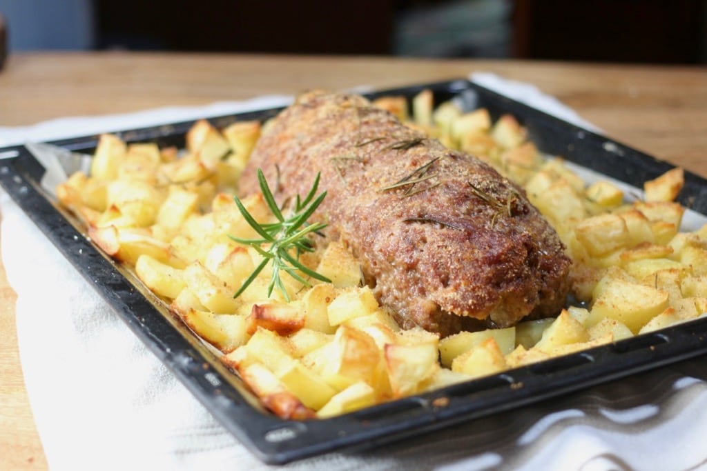 Peel the potatoes and cut them into chunks after washing them. Season them with oil, salt, pepper, and rosemary. Shape the meatloaf with your hands and place it on a baking tray lined with parchment paper. Add the potatoes all around. Another generous drizzle of oil and bake at 355°F, static, for about 50 minutes. Serve.