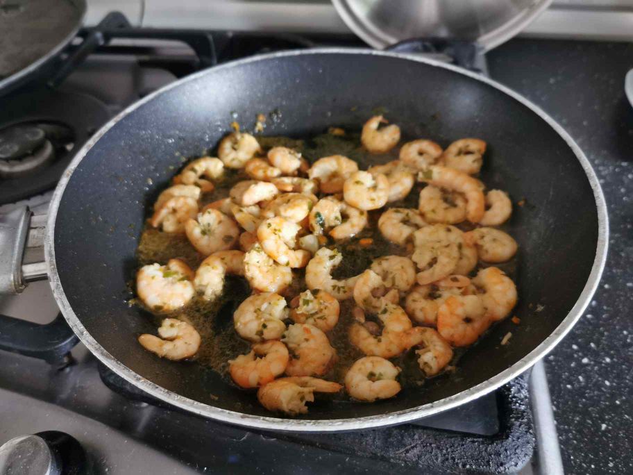 Now let’s take care of the shrimp, washed, cleaned, and shelled. Sauté them in a pan for a few minutes with oil, a clove of garlic, which we will then remove, soy sauce, fresh chopped parsley, spices