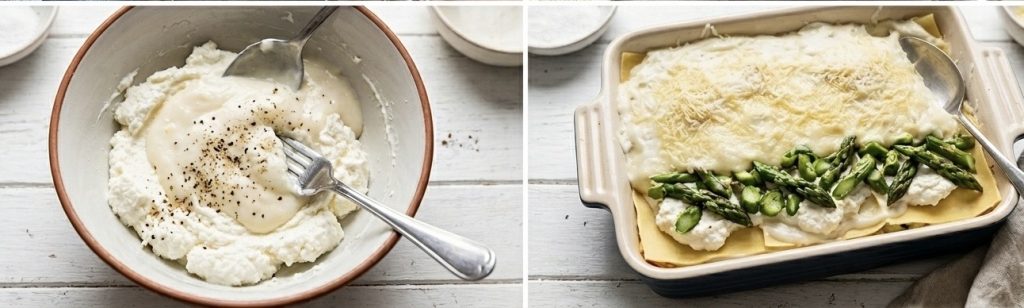 Assemble the lasagna: In a baking dish (about 8 x 12 in) spread a ladle of béchamel on the bottom. Place a layer of fresh lasagna sheets, then béchamel, ricotta cream and asparagus. Repeat the layers until all ingredients are used. Finish with plenty of béchamel and sprinkle with grated Parmesan.