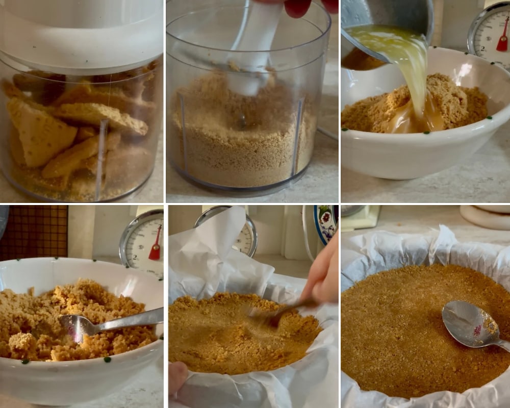 Prepare the base: Blend the biscuits in a mixer until you obtain a coarse flour. Melt the butter and mix it with the blended biscuits and honey. Spread the mixture on the bottom of a 20-22 cm springform pan lined with parchment paper, pressing down well with the back of a spoon. Refrigerate for 30 minutes.