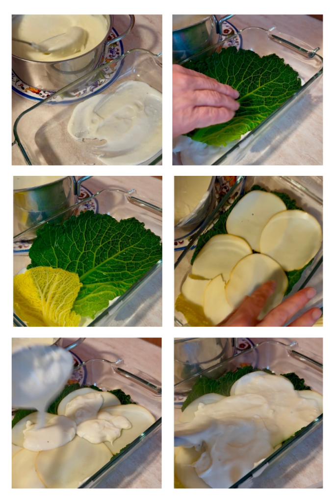 In a baking dish, lay a first layer of béchamel sauce on the base, then add one or two cabbage leaves, three or four if they are small. Continue with the layer of scamorza cheese, and finally a sprinkle of Parmesan.