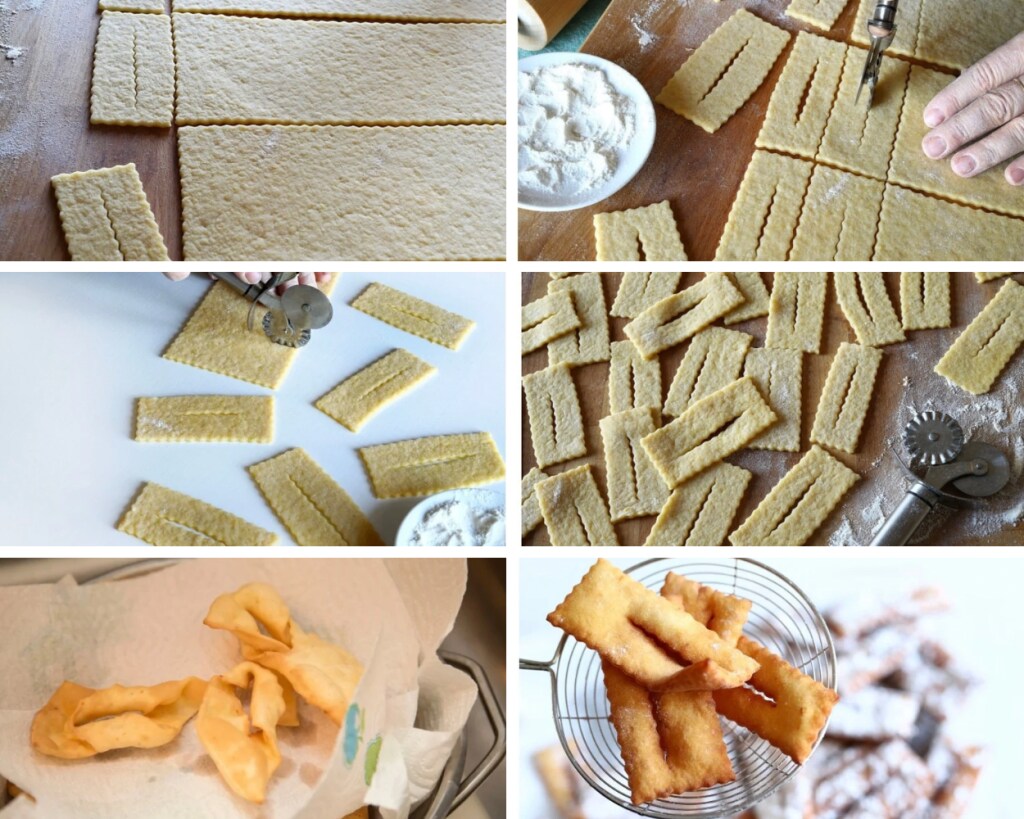 • Once you have a soft dough, roll out thin sheets. With the fluted wheel, cut the sheet into small portions (preferably in strips) and fry them in plenty of hot lard or peanut oil.