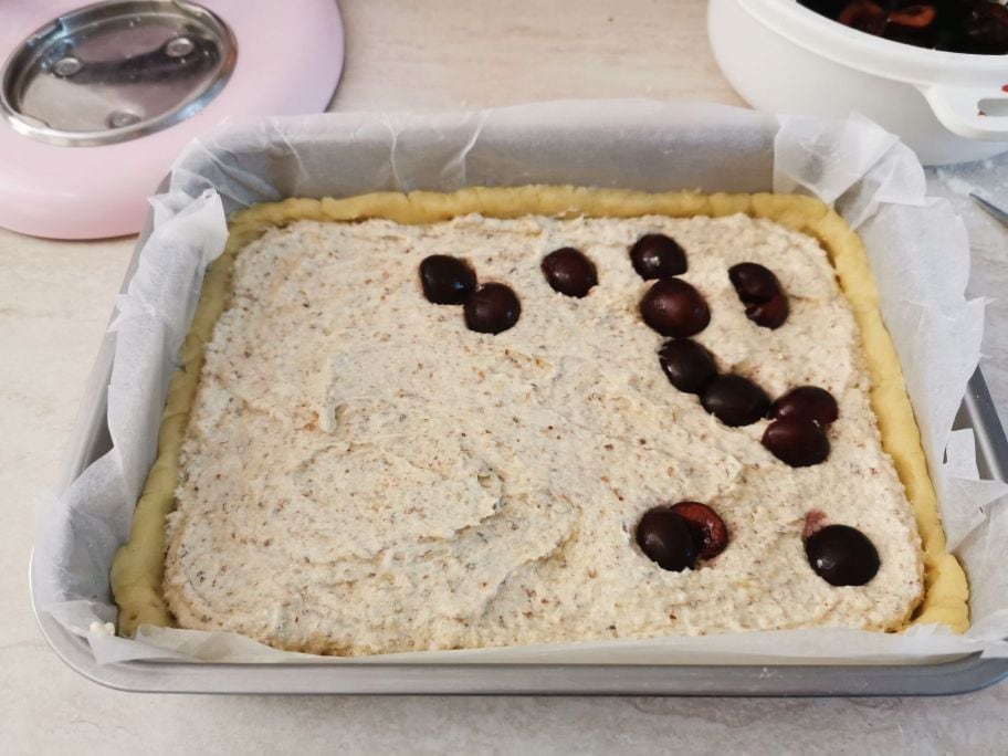 Pit the cherries and place them on the cream, covering the cake. Bake in the lower part of the oven at 356°F for about 40 minutes. Let it cool before serving