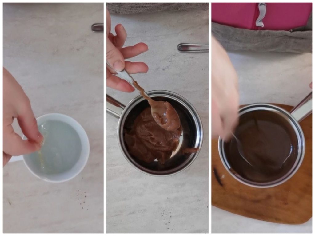 Start by soaking the gelatin in cold water for 10 minutes. Heat the chestnut cream over low heat in a saucepan. Squeeze the gelatin and incorporate it into the warm cream, stirring until completely melted. Transfer the mixture to a bowl and let it cool