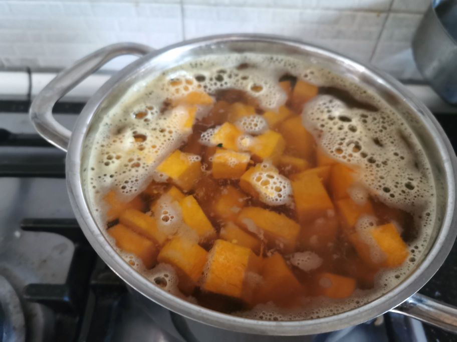 Clean the pumpkin and cut it into regular cubes. Cook them in boiling water until they are soft, then let them cool