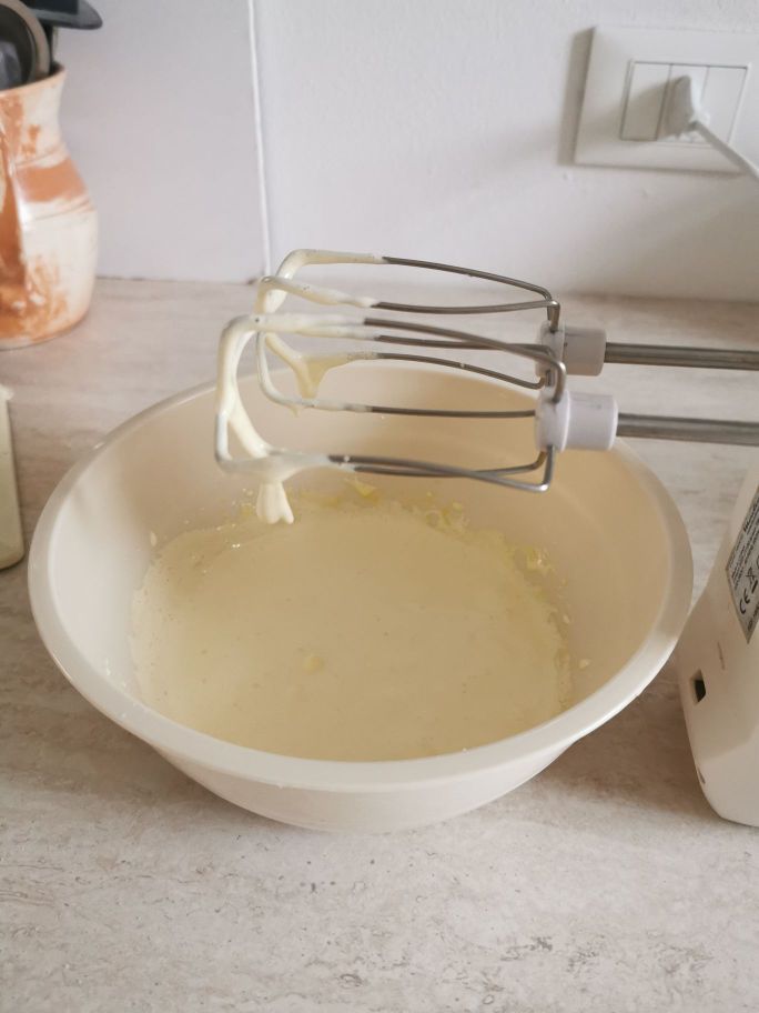 Then pour the sugar into the yolks in a trickle, and whip with the electric whisks at maximum speed, until you get a frothy, tripled, and cold mixture (5 minutes). Soften the cold mascarpone with a spoon to make it softer.
