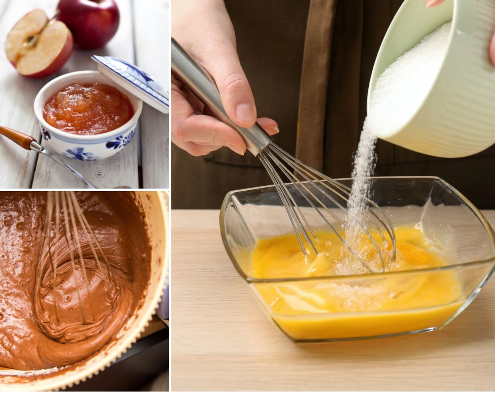 Prepare the apple sauce: Peel and cut the apples into cubes. Put them in a saucepan with a little water and cook on low heat until soft. Mash them with a fork or blend to obtain a smooth puree. Let it cool completely.