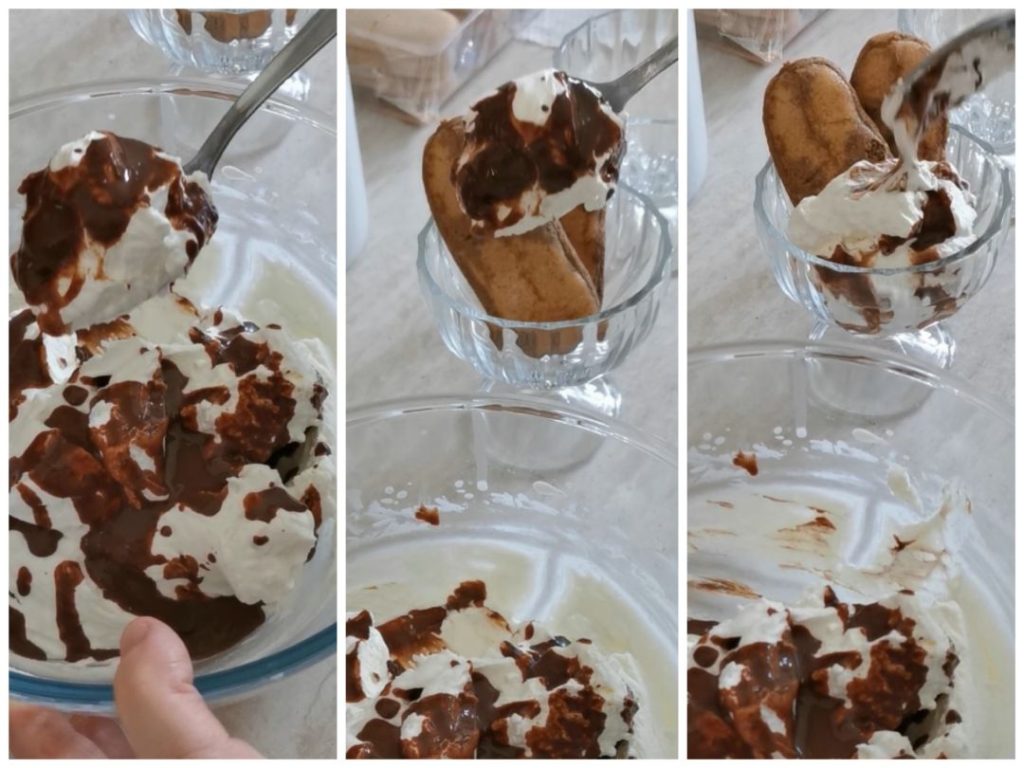 In a bowl, pour 130 ml of cold coffee, 100 ml of liqueur, and a teaspoon of cocoa powder, mix well. In another bowl, pour the remaining coffee, a tablespoon of liqueur, and the remaining cocoa, mix. Pour a bit of the obtained sauce over the cream of cream and mascarpone. Then quickly dip 2 biscuits, on both sides, in the other bowl and place them in a cup, leaning against the edge.