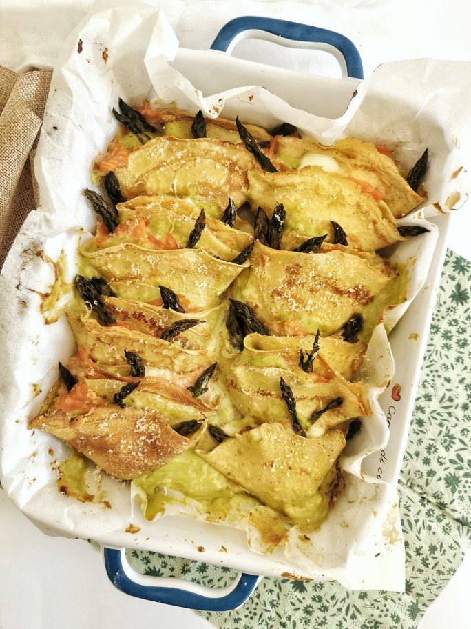 Take a baking dish and cover the bottom with béchamel, and sprinkle with breadcrumbs. Fill one crepe at a time, placing a bit of the ricotta, asparagus, and salmon mixture in the center, fold it over itself, like a fan, continue until the crepes are finished, and place them in the baking dish. Once filled, cover the crepes with the remaining béchamel and a bit of grated parmesan. Bake everything in a hot oven at 355°F for about 20 minutes, until browned.