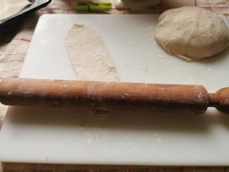 Start by mixing the flour with the salt. Add the finely chopped rosemary with a knife, mix, make a well in the center, add water and oil. Quickly knead until you get a ball. Wrap it in cling film and let it rest for 10 minutes. Meanwhile, preheat the oven to 482°F.