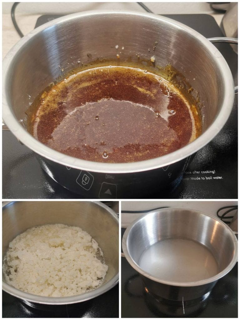 Prepare the caramel. In a pot pour the water, add the sugar and bring to a boil over medium/low heat, without stirring. As soon as it turns amber, turn off the heat and dip the bottom of the pot in cold water for a few seconds, to stop the cooking. The caramel for glazing should be of a brown color, with a soft consistency, not completely fluid, so you need to stir continuously, to achieve the right softness. If it hardens, heat it in a bain-marie