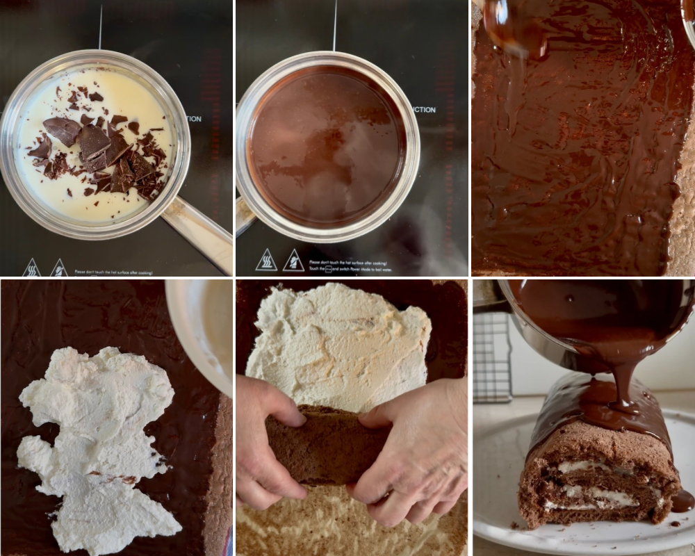 Unroll the biscuit, fill with ganache, and spread the whipped cream on top, roll it up again and cover with the remaining ganache.
