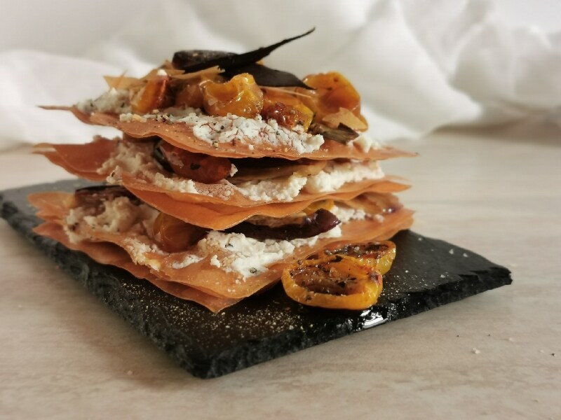 We start with a base of phyllo dough, filled with a ricotta and Parmesan cheese mousse. We continue with marinated eggplant, oil, salt, pepper, balsamic vinegar, soy sauce, and a mix of spices. To finish with confit yellow cherry tomatoes, which consist of delightful and flavorful caramelized cherry tomatoes, sprinkled with sugar and aromas, baked in the oven. We assemble everything, and here is our wonderful and fragrant eggplant, ricotta, and confit date millefeuille, believe me, it will become addictive.