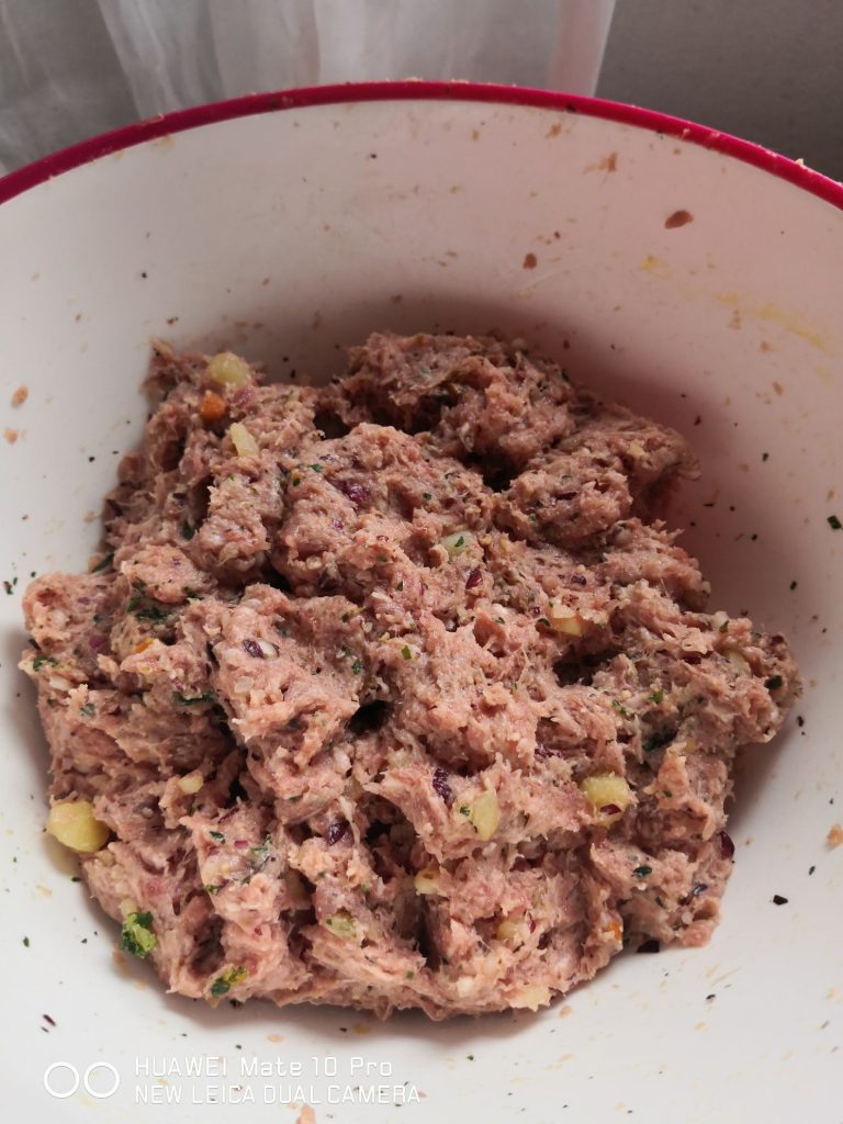 Let’s start the dough, mix together the ground meat, a pinch of salt, parsley, and onion. Work the dough well with your hands; the mixture should be soft, malleable, and compact, without any lumps.