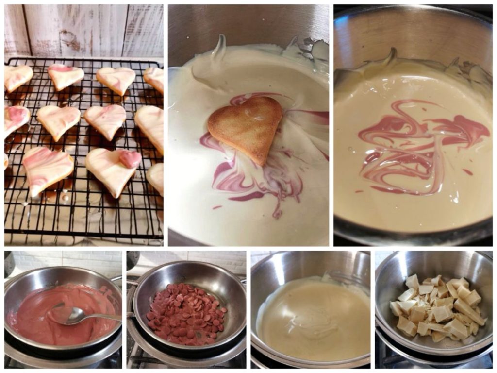 Melt the chocolate in a double boiler as you see in the photos above. Or in the microwave at 500W, stirring every 30 seconds; the chocolate should melt slowly and not exceed 113°F. Once ready, put a small part of the pink chocolate into the container with the white chocolate, creating the marbling, gently swirl with a toothpick. Press the cookies face down into the chocolate, drain or lightly tap off the excess chocolate, then place them on a cooling rack to dry. Marble the chocolate several times, and dip the cookies until finished. Let the cookies dry overnight
