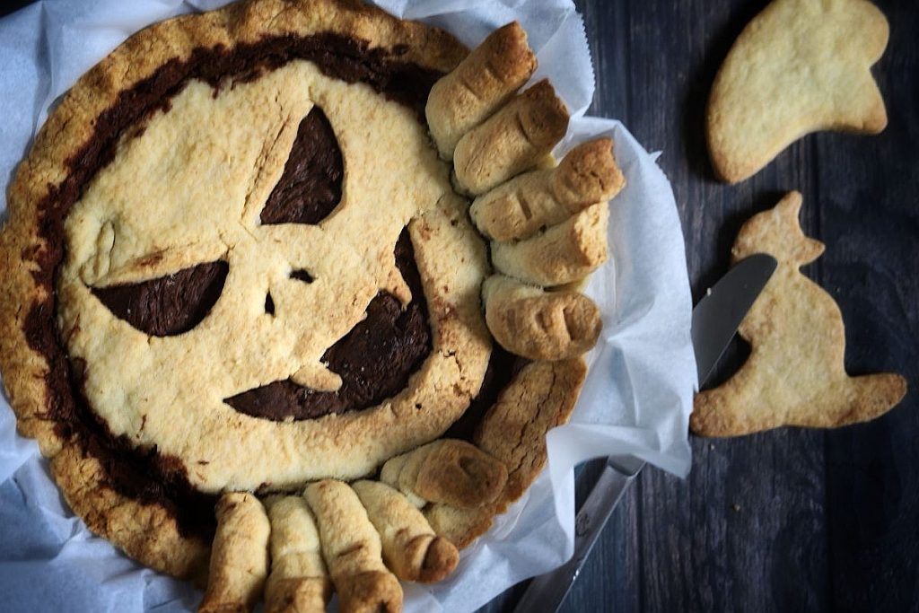Take the other half of the dough and roll it out on a sheet of parchment paper, with a thickness of half an inch. With a sharp knife, cut out the eyes, and the smile with sharp teeth, and make two holes for the nose. Remove the cut-out shortcrust pieces. Place the face on the surface of the cake, if there are rough spots, use some water on your fingertips to “erase” them. Press the edges of the tart together.