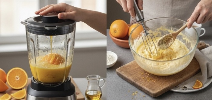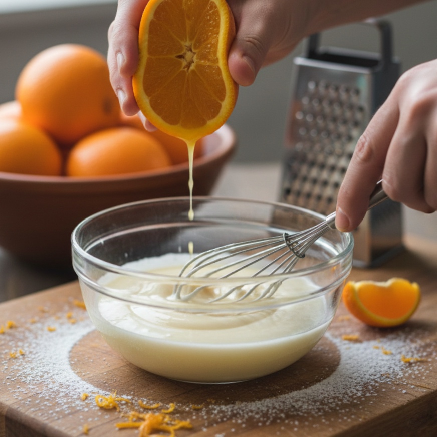 Combine the mixtures: Add the orange and oil cream to the beaten eggs, mixing gently.