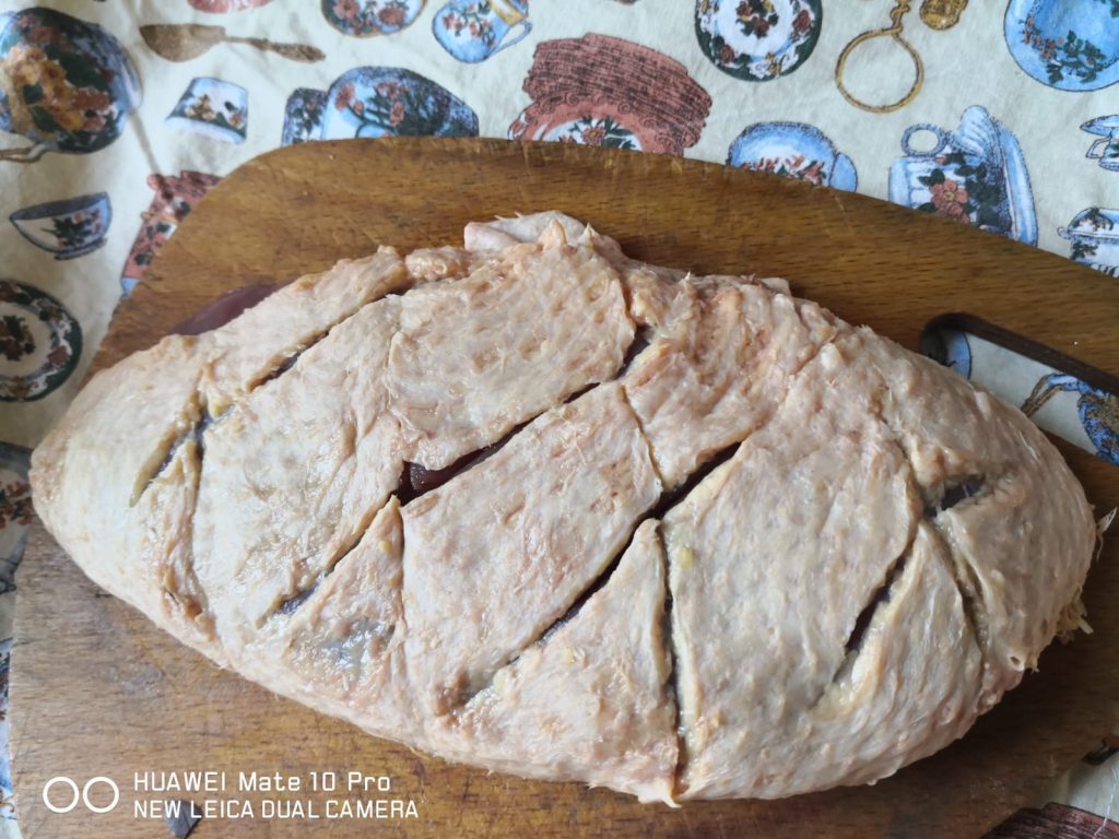 Prepare the baking tray lined with parchment paper and lay the orange slices on the bottom. Place the breast on the orange slices and baste it with the juices released in the pan. Once rehydrated, you can spoon over the ingredients for the glaze, which I’ll explain how to make shortly: in a bowl, mix vinegar, honey, Worcestershire sauce, a pinch of salt, and the juice of one orange. Mix well. The breast is ready to be baked.