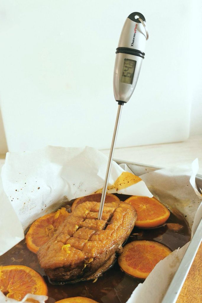 Bake the tray and let it cook at 320°F for about 25 minutes for a pink center, 30 minutes for medium doneness. Alternatively, you can use a kitchen thermometer; the right temperature for the meat should be around 140°F. Just take the meat out of the oven for 2 minutes, measure the temperature, and put it back in if it doesn’t reach 140°F. Place the meat on a cutting board, let it rest for 5 minutes, slice it diagonally following the cuts in the fat. Serve by pouring the cooking juices over it, and serve.