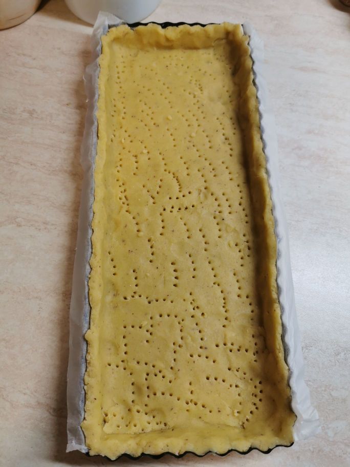 • Roll out the shortcrust pastry with a rolling pin, and line it in a previously buttered rectangular tart pan with a removable base. Prick the bottom with a fork and bake blind at 350°F (approx. 180°C) for 15/20 minutes. Remove from oven and let cool.