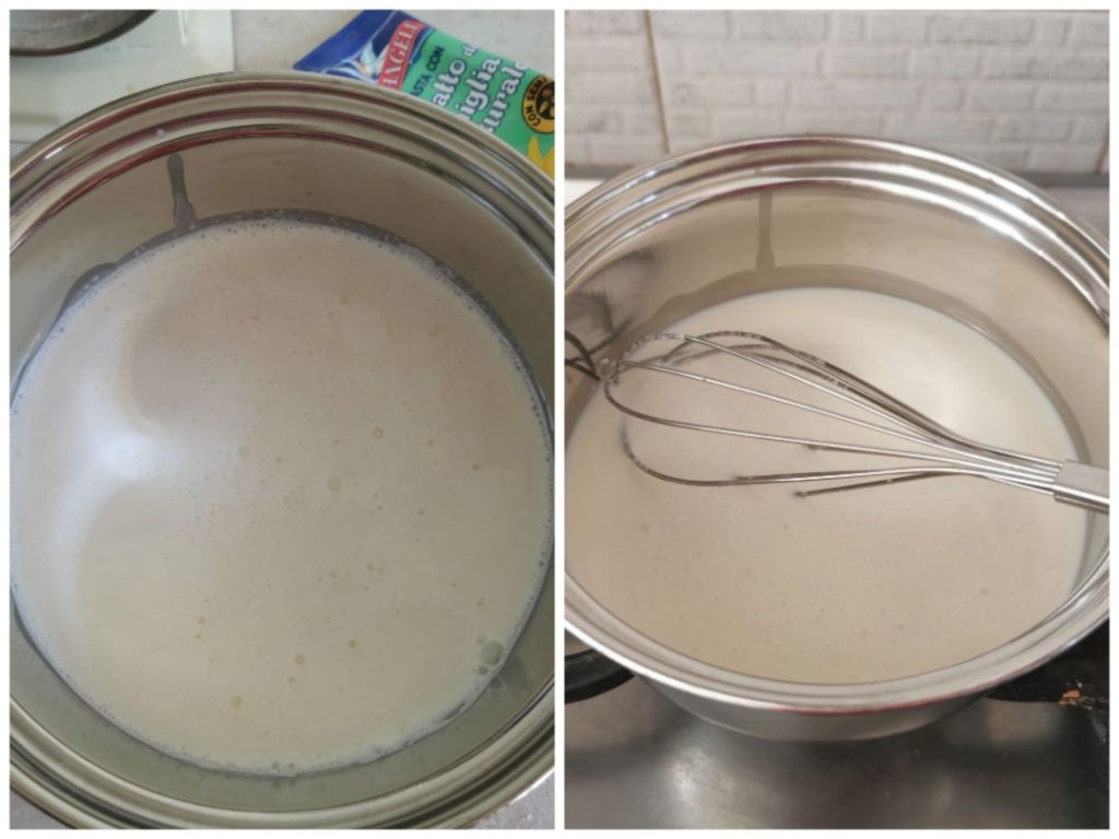 • Pour the milk and heavy cream into a saucepan. As soon as the liquid boils, add the blueberry sauce, stir and add the gelatin sheets, well squeezed with your hands. Mix everything well, stirring with a whisk