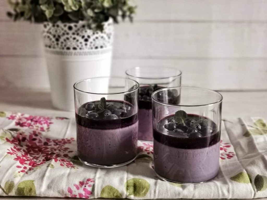 • Divide the dessert into 4 glasses (if you’re interested in purchasing them, click here) let it cool, then put in the fridge to chill the panna cotta, for at least a couple of hours. Once ready, garnish the dessert with the blueberry sauce set aside earlier, if it’s too thick you can add a few drops of lemon. Garnish with fresh blueberries
