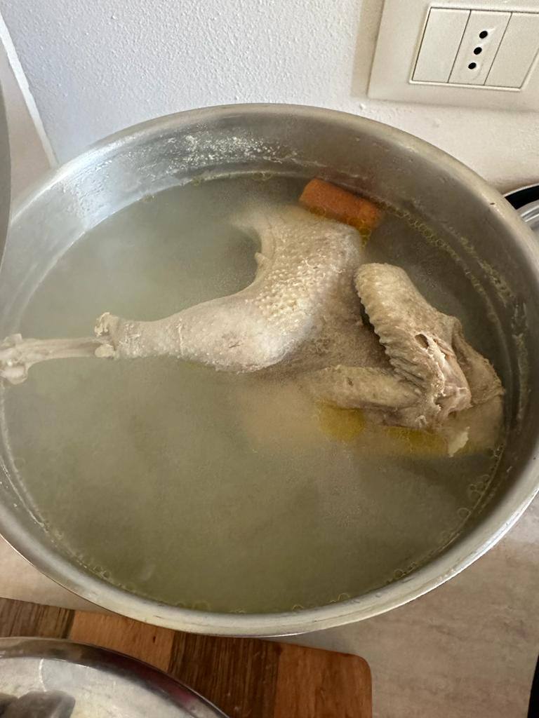 • Cooking beef/veal with chicken. Place a pot on the stove with about 5 qt of water, add 2 peeled carrots, a bunch of parsley, 2 onions into which I’ve stuck the cloves, and 2 stalks of celery. When the water starts to boil, add the pieces of beef/veal and the hen (cleaned, and remove any residual feathers by singeing). Cover with a lid and as soon as it resumes boiling, lower the heat to the minimum and continue cooking for about 2 and a half hours. Skim the broth two or three times during the first half hour. During cooking, the boil should be minimal, the meats must always be covered with liquid. If necessary, add a little boiling water to stay at the level.