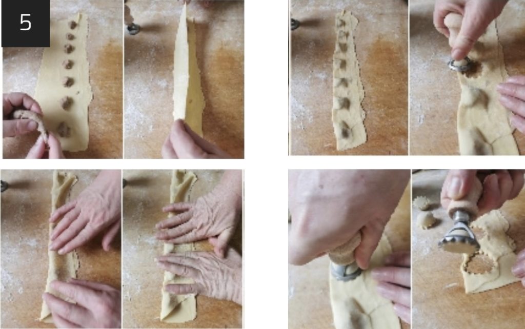 • Place the flour, eggs, and a bit of salt in the mixer, and prepare the dough. Once ready, make a dough ball, which you will cover with a towel. Cut a slice of dough and roll it out into a thin sheet with the pasta machine. Place, as seen in the photo, many balls of filling, spaced 2/2.4 inches apart, fold the pasta to cover the filling, and cut with the metal anolini cutter, which, once ready, will have the shape of a small crescent. Cook them in traditional beef broth and serve